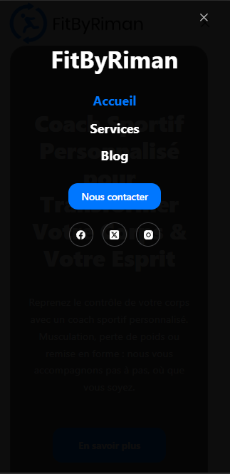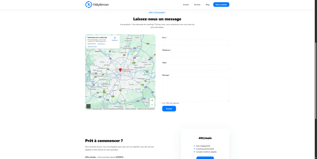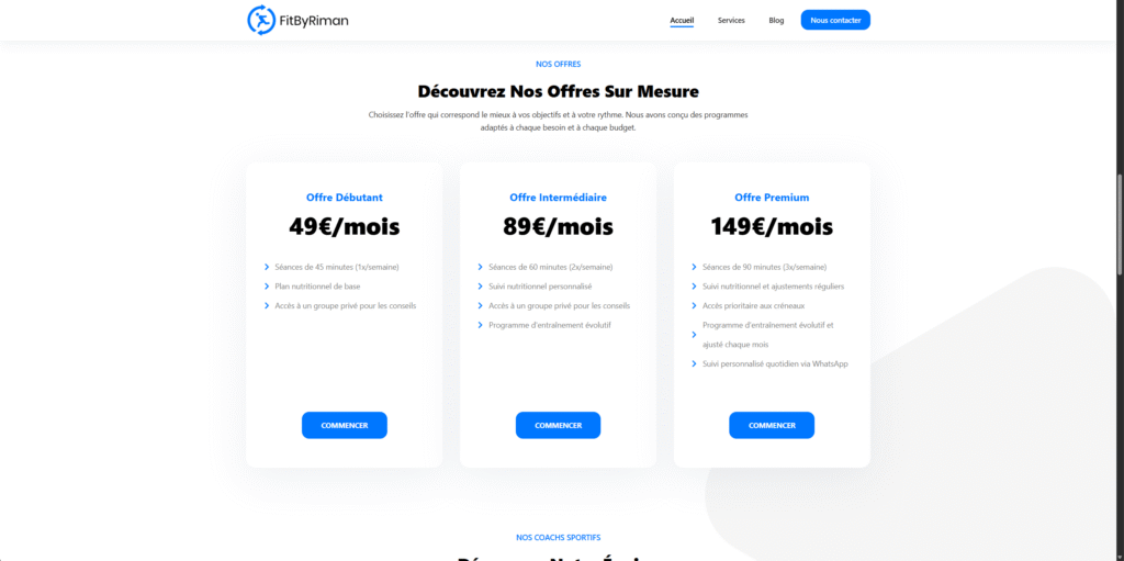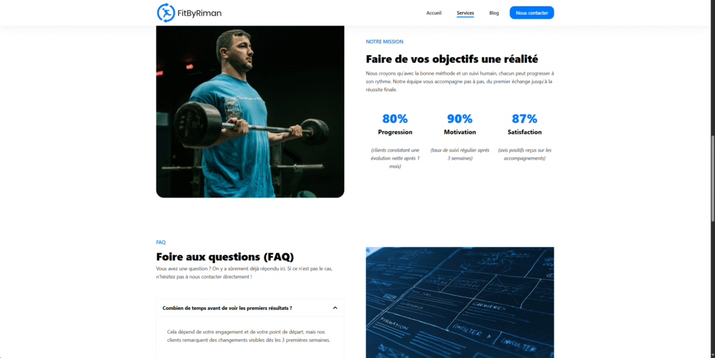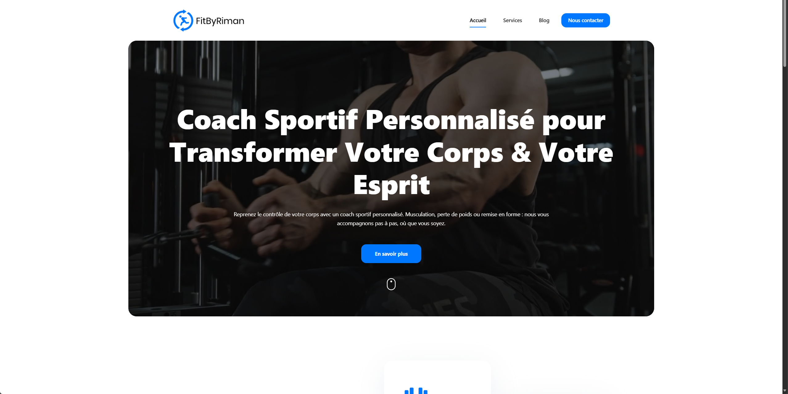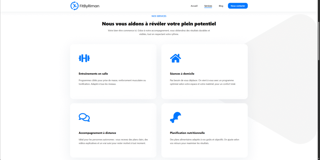 La page d’accueil est la vitrine principale. Elle présente directement les services proposés par FitByRiman ainsi que les bénéfices pour les clients.