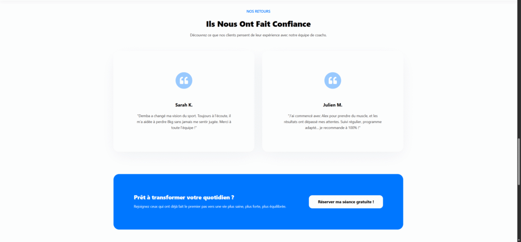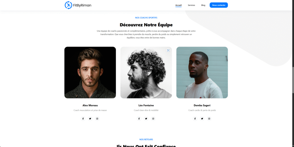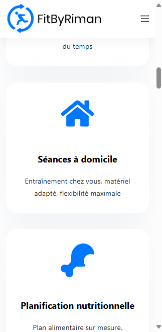 J’ai aussi intégré une section Notre Mission pour mettre en avant les valeurs de FitByRiman : un suivi humain, une progression adaptée au rythme de chacun, et un vrai accompagnement.